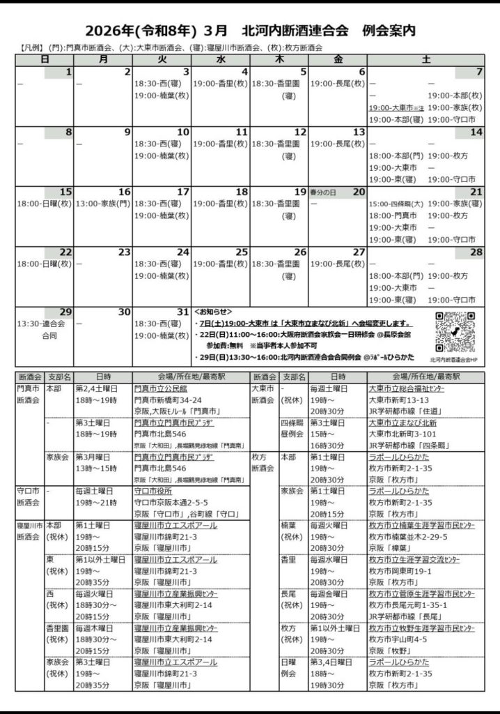 2026年(令和8年)3月 北河内断酒連合会 例会案内について