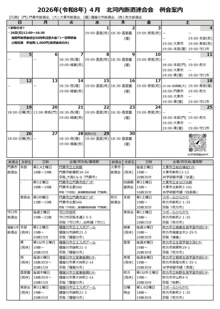 2026年(令和8年)4月 北河内断酒連合会 例会案内について